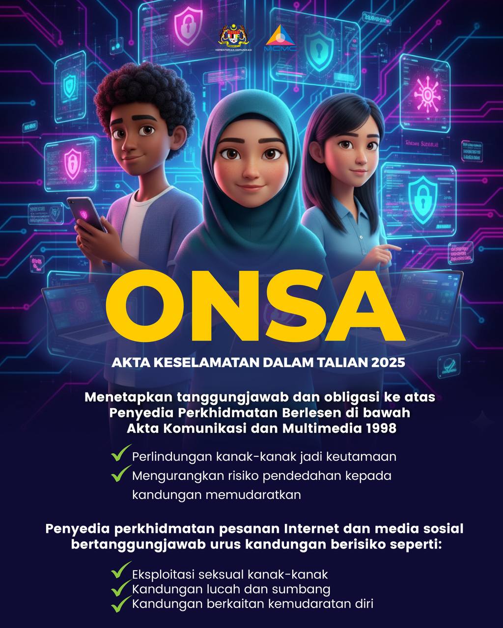 Akta Keselamatan Dalam Talian 2025 (ONSA) memperkukuh tanggungjawab platform digital demi keselamatan pengguna. Perlindungan kanak-kanak diutamakan, kandungan memudaratkan wajib ditangani. Keselamatan dalam talian bukan pilihan, ia tanggungjawab bersama. Maklumat lanjut mengenai ONSA boleh didapati di laman sesawang MCMC dihttps://mcmc.gov.my/en/onsa/home MCMCNADIMCMCONSA